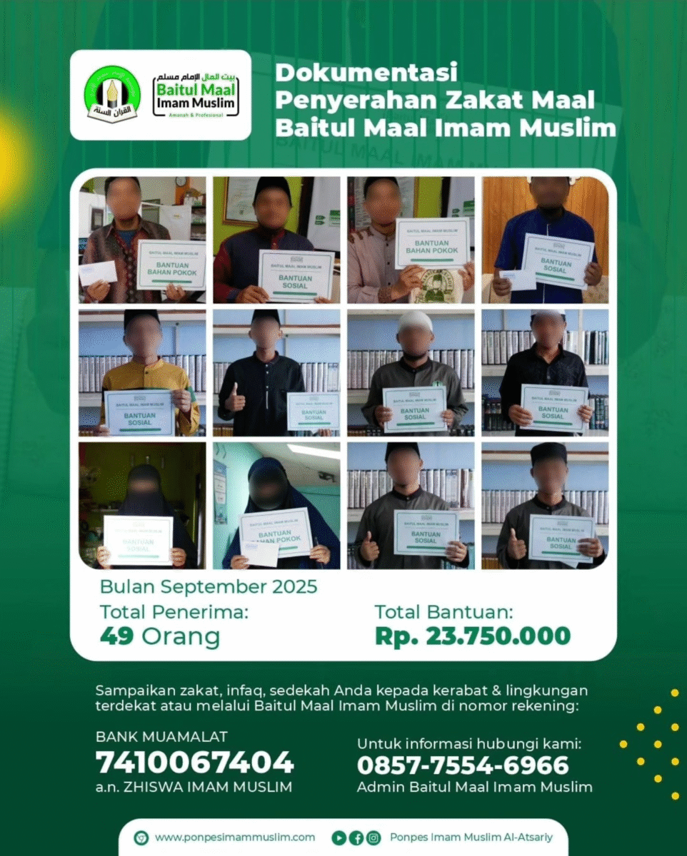 Alhamdulillฤh, segala puji bagi Allah Subhanahu wa Taโala atas segala limpahan karunia dan kemudahan-Nya. Pada bulan September 2025, Baitul Maal Imam Muslim kembali menyalurkan Zakat Maal kepada para penerima manfaat.